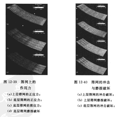 振動篩篩分的DEM仿真結果可以用于分析顆粒群再篩網上的松散度、振動強度、料層厚度、篩孔孔徑和篩面傾角等參數對分離粒度及篩分效率的影響及相互作用。顆粒群再篩網上的流動平衡、顆粒對篩網的沖擊速度計施加在篩網上的載荷也能通過DEM仿真結果獲得,從而確定篩網所受的應力、篩網的磨損及篩分裝置的功率、圖12-39和圖12-40分別為Yuan等人通過DEM仿真獲得的篩網上的作用力圖和篩網的沖擊與磨損破壞圖。
